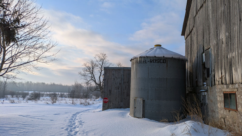 But putting eavestrough on a barn is a bit different than putting it on a house. Our barn is big. It’s tall. Part of the roof is covered with solar panels. It took me a bit to find a company to do it. (I went with Siderman and highly recommend them.)