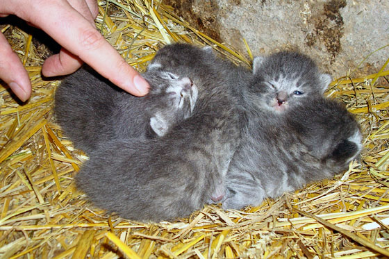 The kittens are now in a stall in the basement of the barn. For the first time, we’re able to see them clearly, so we can confirm we have four kittens. They’re two weeks old, so their eyes are starting to open, but they’re not very mobile yet.