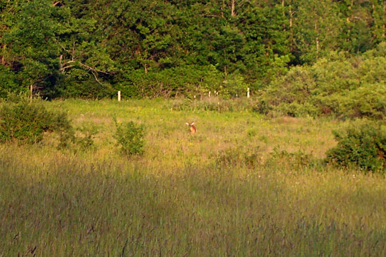 We see deer fairly frequently at the farm. Their tracks and trails are everywhere. One showed up in the flesh (fur?) walking along the row of pines right beside the house. She was within a dozen metres of us. Of course, as soon as she realized she’d been spotted, she bounded away rather than posing for a picture.