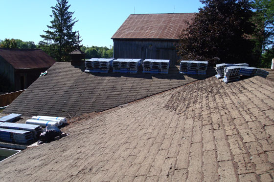 The end of day one: Note the naked roof and the new shingles waiting to be installed