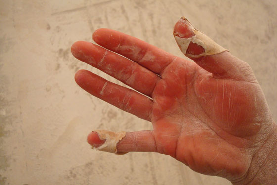 This is what my hands looked like at the end of a night of sanding. The bandages are pretty much worn away.
