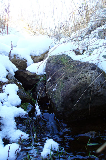 At the bottom of the meadow, the creek was flowing into the pond amongst the snow-covered boulders.