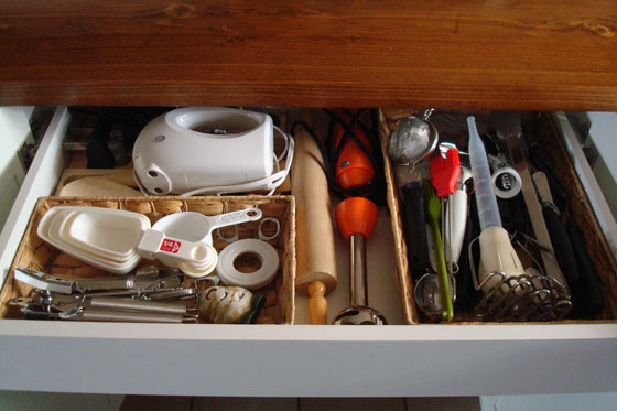 In our whole kitchen, we have only three drawers, and very narrow ones at that. I would have happily made the island all drawers, as I think they’re more useable than cabinets. However, in consideration of the budget, I only included one drawer. The good news is, it’s large and, while it may look cluttered, it is in fact very functional.