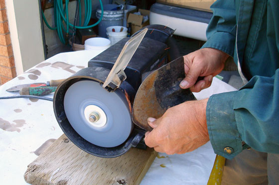 To sharpen the shovel, hold the back side of the blade at a very shallow angle against the grindstone. Start about halfway down the edge of the blade and curve around to the tip. Do a couple of passes on one side and then on the other.