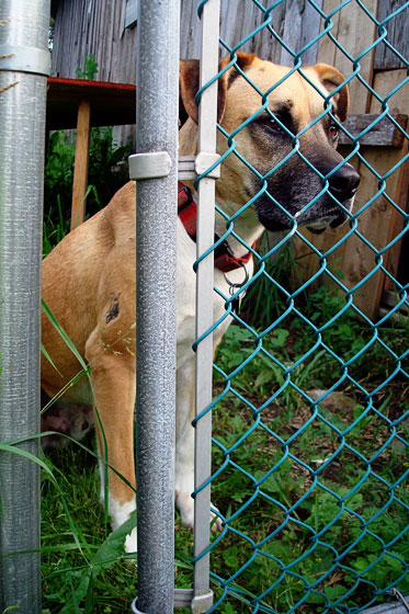 We did revisit the run on the Day of the Skunk. I’d given him a bath and kept him on his long leash outside all morning, but I had to come up with a better solution when I couldn’t put off going in to work any longer. I chose the run. I took the long leash and snapped it onto the fence just in case, gave him his kong full of kibble and a big dish of water, latched the gate and drove away.
