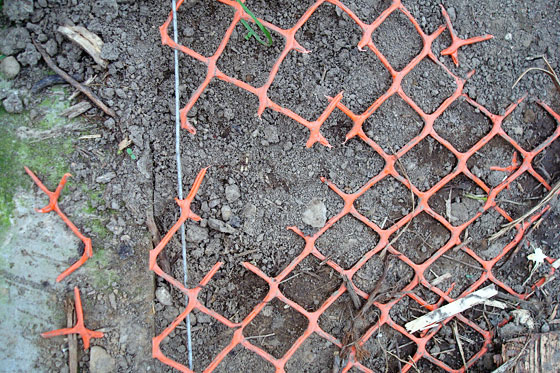 I buried the mesh in dirt and then covered it all with a layer of wood chips. The result of that was more excavation and another demonstration of Baxter’s strength–this time in his teeth. Look at how he tore the mesh.