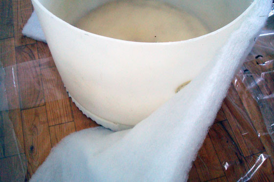 7) You’ll notice that my batting was a little patchy. To smooth it out and hold it in place, I added two more layers of batting over top of the whole barrel. I’m going to try to explain how I did this, but if it’s not clear, feel free to ask for more information in the comments. I draped the big sheet of batting over the whole barrel making sure it hung evenly down each side.