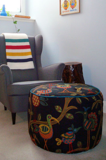 And here’s my finished ottoman sitting with Strandmon and the stump table in the reading nook.