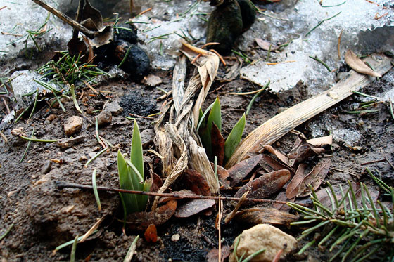 In the garden I built around the well, peaking up through the sopping mud, are some very small spears of iris.
