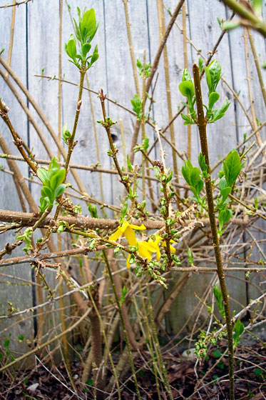 Two weeks later than last year, six weeks later than our first year, our forsythia is finally in bloom… if you can call it that.