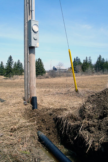 Of course, it wasn’t simply a matter of waiting for the snow and frost to melt so that the trench could be dug. The trench was more than 300 feet long. Over that distance, we needed a special heavy-duty type of wire, so that we didn’t lose power. Pulling the wire through the trench was another bit of fun. When the trench was dug, the excavator laid a conduit in the bottom. It looks a bit like weeping tile.