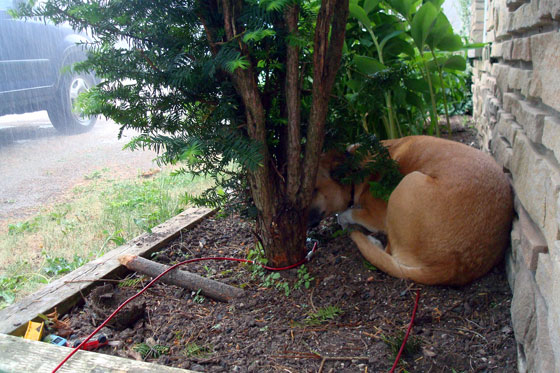 Poor Baxter did not appreciate the cooling moisture as much as the plants did. Apparently, melting from the heat is preferable to melting from rain.