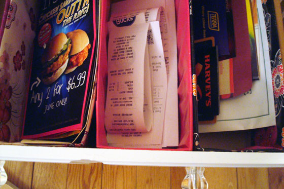 The first part of my system is a receipts bin. This is just a cereal box covered in wrapping paper (a tip I picked up from IHeart Organizing) and tucked into a drawer in my office. Receipts come out of my wallet and into the bin. (Other bins hold gift cards, takeout menus and coupons).