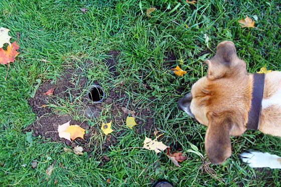 Then, I used a very narrow shovel–since we don’t have a posthole digger lying around–to dig a 16 inch deep hole.