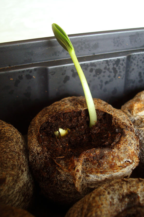 The sprouts continued to die, but I was very surprised that some new sprouts started popping up as things dried out. We have a new watermelon–our first of the Crimson Sweet variety–and a whole bunch of new tomatoes. I know I’m going to have to separate the sprouts that are doubled (or tripled) up. I’m not sure I can bring myself to pinch out the extra sprouts, but I’m not sure I can keep everyone alive if I try to separate and transplant them. Any advice?