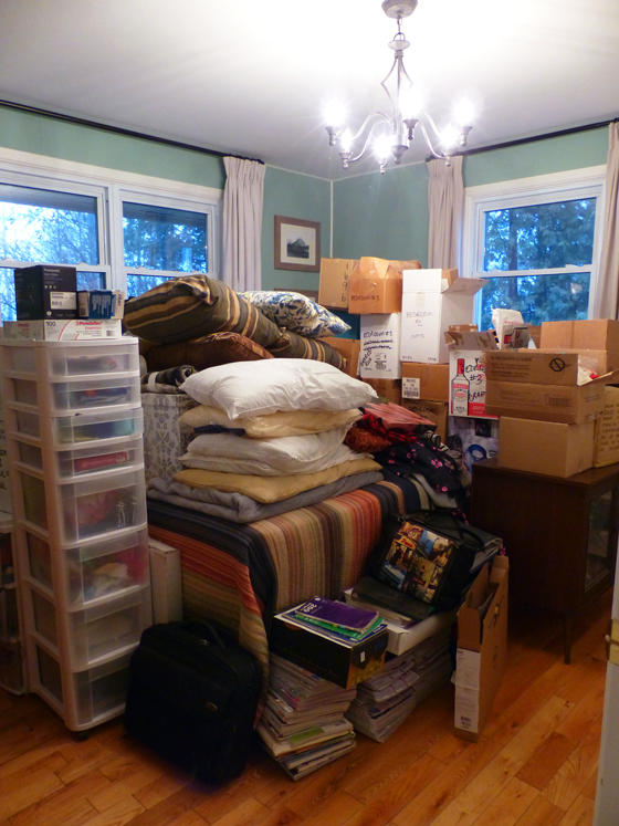 First up, the guest room, which is holding all of the things that used to be in my office. Oy vey. My poor pretty guest room. I hope no one wants to come visit for a little while.