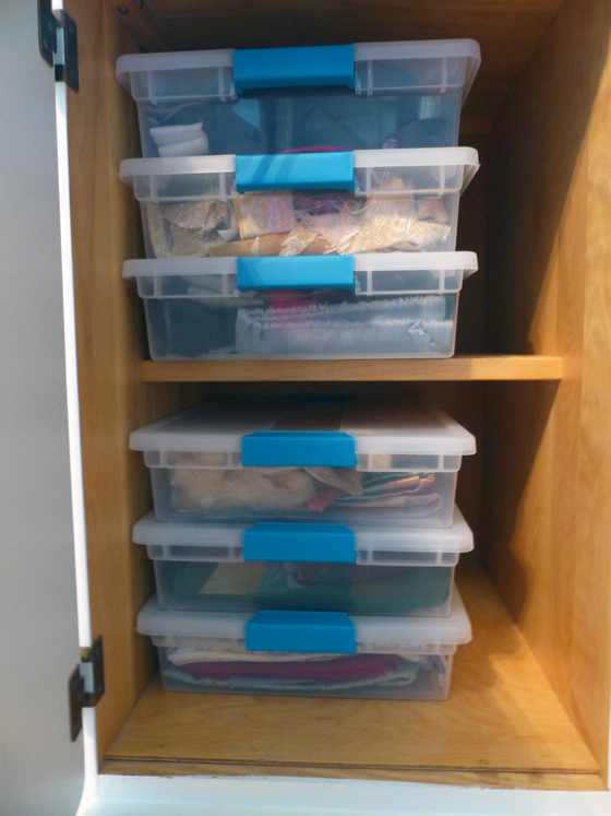 Six smaller containers hold all of my fabric remnants and fit perfectly into one of the cupboards in the china cabinet.
