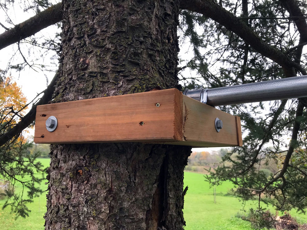 The tires are bolted to the wood frame of the treehouse and then to each other. To make the tires easier to climb, I realized I needed to convince them to slope, rather than hang vertical. I ended up digging a hole at the base of the ladder and sinking a couple of concrete blocks under the ground. I wired the bottom tires to the blocks and buried the whole thing.