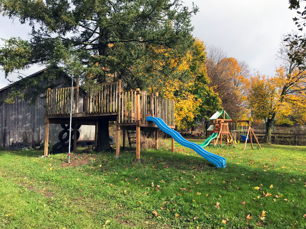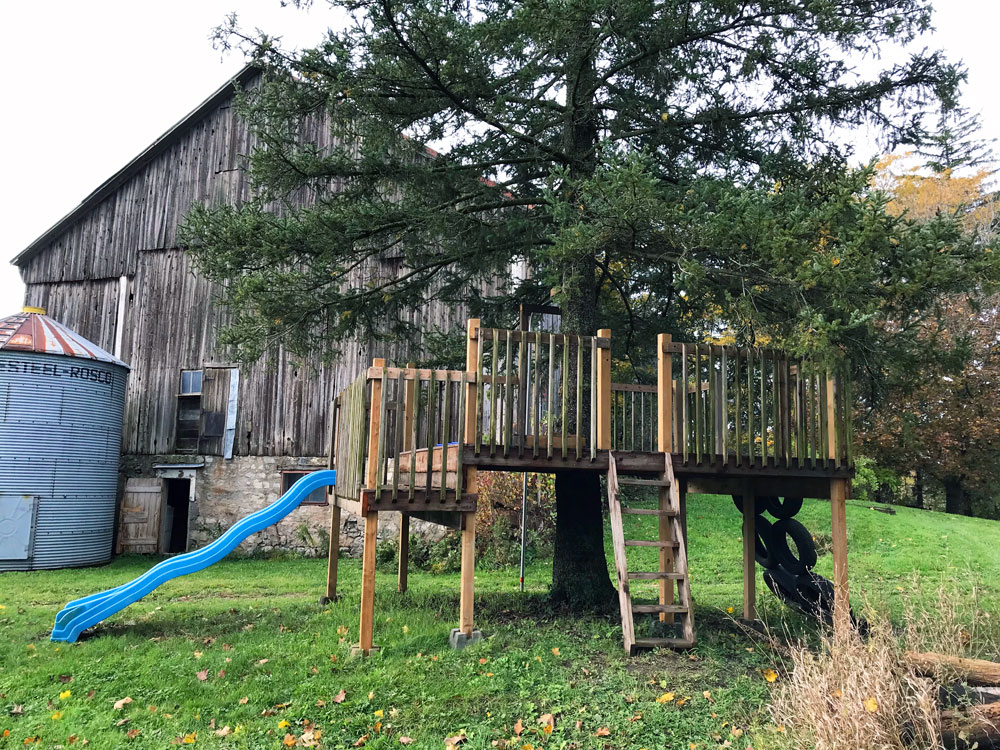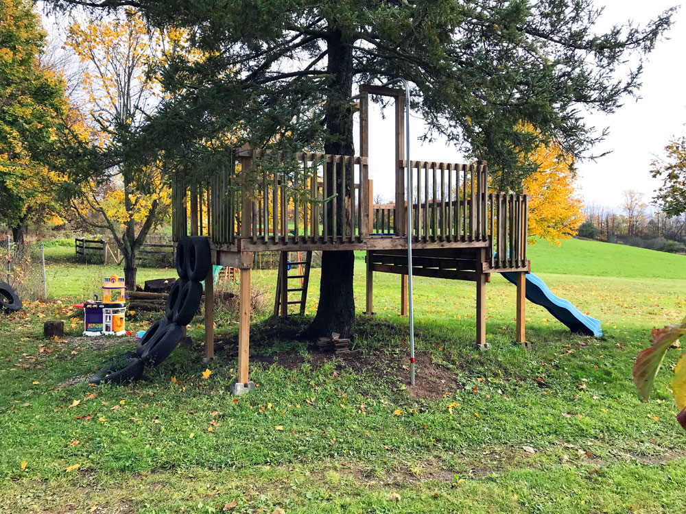 The slide resulted in the biggest adjustment I had to make to the treehouse plans. I had built the deck at 5 feet high, which seemed to be the right height for our 10 foot slide.