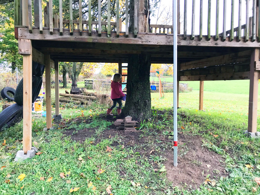 The base of the pole extends into the ground and is encased in concrete. At the top, the pole turns 90 degrees and is affixed to both the treehouse railing and the tree itself. It is solid. In fact, it’s my preferred way to get down.
