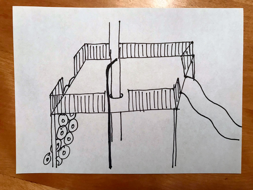 At Krista’s treehouse, my inspiration, their deck had ended up too high, and they had to build a few steps down to lower the slide. I wanted to avoid that. But as soon as I propped the slide up onto our deck, it was obvious it was too high. Ellie bravely went down twice, but it was scary fast.