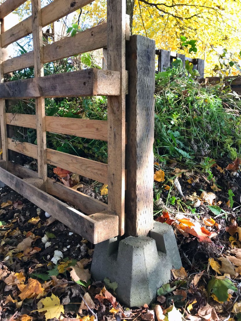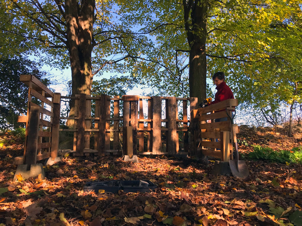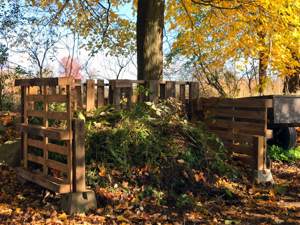 Skids are a common material these days for compost bins, but most bins are four-sided. I’ll see how our three-sided bin works and adjust if I need to.
