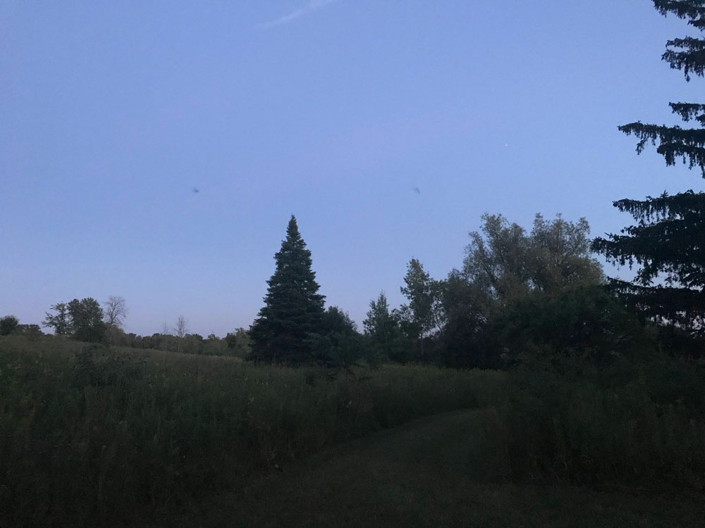 This summer, we participated in a bat study organized by the Toronto Zoo. Our contribution was installing an acoustic monitor for four nights to record the calls of bats here at the farm. (The two dark smudges in the sky in the photo above are some of the bats that were flying at the start of my bonfire on Friday night.)