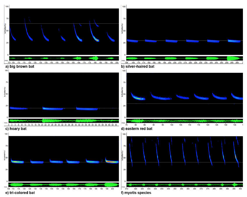 To identify the species, the scientists don’t listen to the recording. Instead they look at the spectogram–the graph produced by the sounds. Here’s what the calls look like for some of the different species.