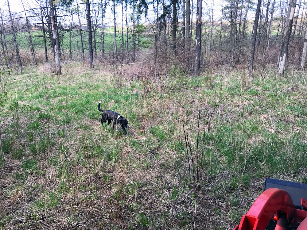 I took advantage of nice weather, a free afternoon, and Ellie at school to hook up the mower. Tasks like this are always a bit intimidating for me. The cutter is huge and heavy. It’s a bit tricky to get everything connected properly. The tractor doesn’t always have great traction, and the ground I wanted to mow was hilly and bumpy–lots of chances to get stuck. (Like Cigo in the photo below, who is actually tangled up in a wild raspberry bramble.)