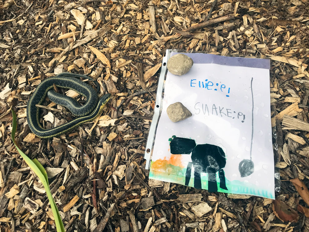 The new well garden has attracted a snake. Ellie has adopted it as a pet, and the snake seems to be just fine with that. He appreciated the picture that she drew for him and occasionally lets her pet him. I love seeing her comfort and gentleness with animals of all kinds.