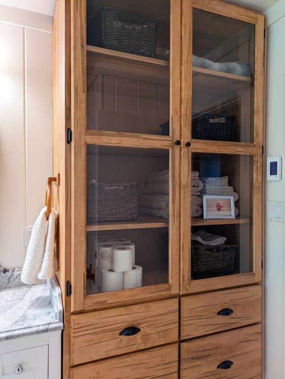 Of course, the big wood storage hutch is another standout. As I wrote 13 years ago, the bathroom had tons of storage, mainly a large linen closet. Unfortunately, its open shelves were ugly and not super functional. Replacing the closet with this hutch adds so much to the bathroom.