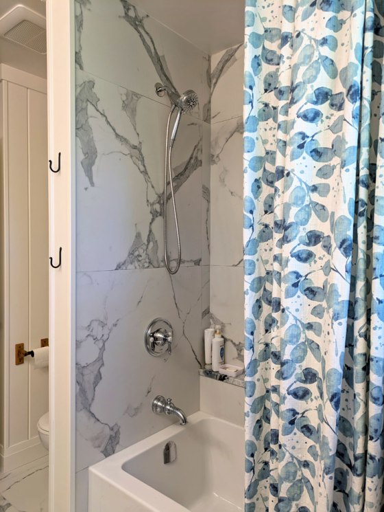 The final finishing touch was the shower curtain. This is our only bit of colour in the bathroom. I chose a watery blue leaf fabric that has a beautiful mix of dark and light that echoes some of the tones in the tile and counter. I sewed the curtain myself. I wanted it to be traditional, so I added some pleats at the top. This gives the curtain lovely fullness. It’s also full length from ceiling to floor which makes the bathroom feel so much taller.