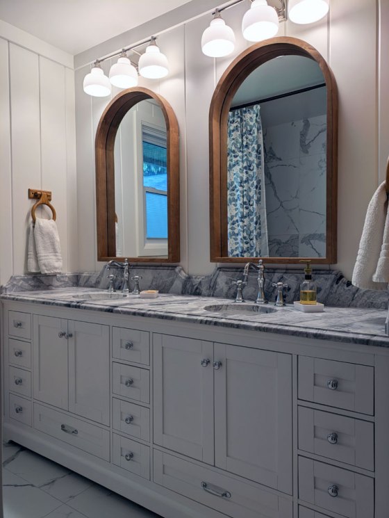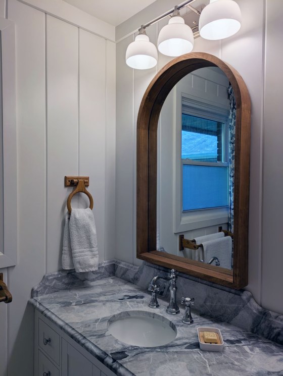 Instead of mixing metals, I decided to warm things up with a lot of wood accents. This is another touch of farmhouse style. The mirrors were the very first thing I bought for the bathroom. The wood frame and arched top add softness to the other square lines in the room.