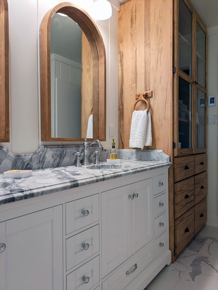 Accompanying the tiles is our marble on the shower ledge and countertop. This marble is a statement. It’s dark and light and dramatic. Adding to the drama is the beautiful ogee edge, the sculpted backsplash and sidesplashes and the leathered texture. I’m so glad I added these details.
