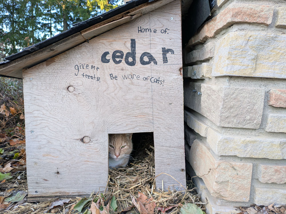 I cleaned the eavestroughs, but it involved a jug of hot water and a chisel. I turned off the last outside tap when temperatures were already below freezing. I dealt with some new to-dos, like resetting our mailbox post after it was knocked over by a street racer and setting up a cat house for Cedar who persists in hanging out under the lilac in the front flowerbed rather than in the barn.