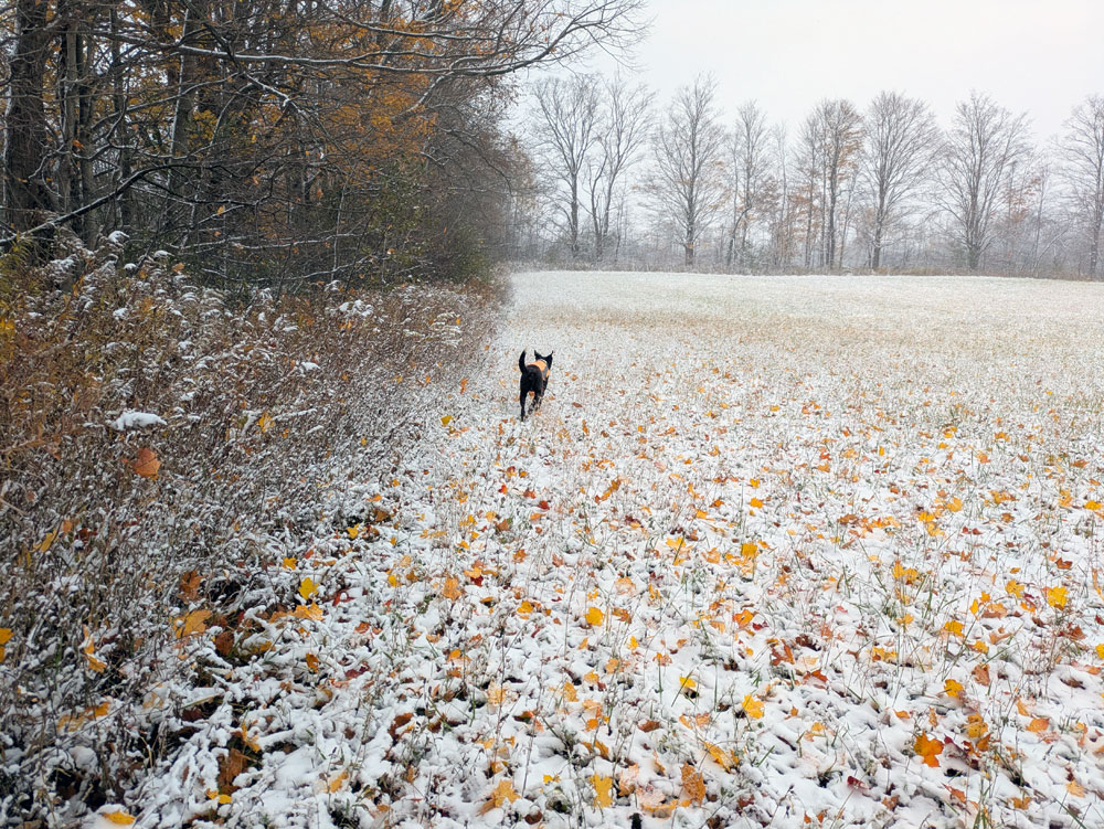 Winter came on fast this fall. I was waiting for all the leaves to fall from the trees before I cleaned the eavestroughs. Then temperatures turned cold. Weather got rainy (causing unfortunate hair-dos for Hair-Do) and then snow.