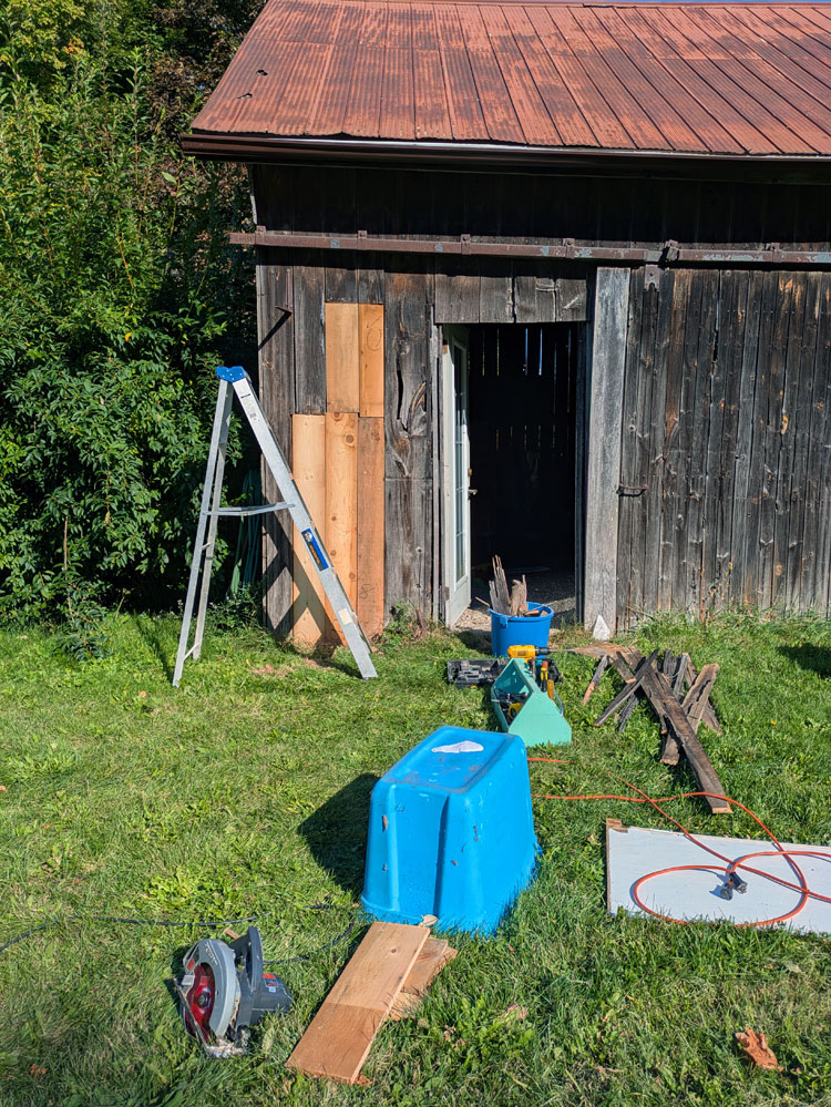 Some time ago (I’m talking more than a year), I noticed some boards on the driveshed were in rough shape. Just how rough became obvious when Cigo got into the driveshed while the door was locked. I didn’t know where he was, called his name and he popped out through the wall. I blocked the hole with a piece of plywood, but I need to do a proper patch with actual siding.