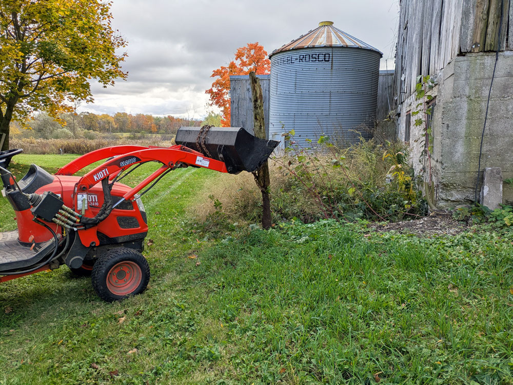 I have been slowly working my way around the barn for years, clearing brush from along the foundation and mowing closer and closer. I was able to get a few loads of dirt this summer from the landscaper who did our patio. He dumped them at one corner of the barn where the grade needs to be adjusted. The corner also held a bush, a wire fence and an old split rail fence. I’ve tackled most of the fence and have just one post left to pull. The bush needs a bit more time with the saw and perhaps a shovel. Then I need to spread the dirt and finally finish this corner.
