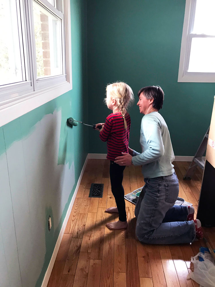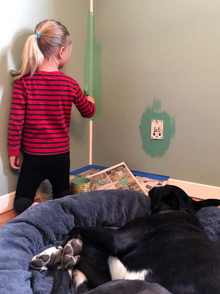 For painting (beyond her craft paints and paper), she’s practiced on a bird feeder and shelves. We’ve built up her knowledge and comfort level over the years, so that she is interested in and capable of being involved in painting a whole room.