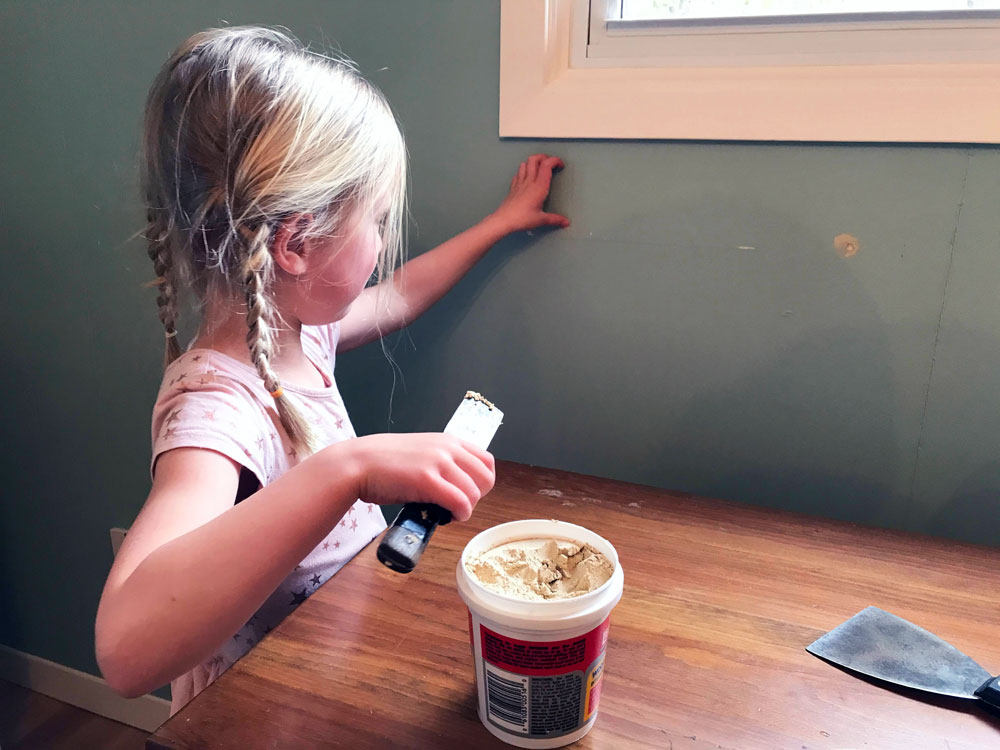 Planning what colour to paint. Going to look at paint chips. Buying the paint (we got to watch the colours being added to the can and then the can being mixed in the shaker). Clearing the room. Patching any holes in the walls (spying holes is a good task for a child). Sanding and priming the patches.