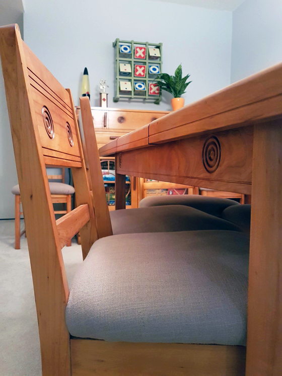 Matt’s nephew and I made the bench almost nine years ago. I’ve been surprised by how much I like having the free-standing shorter bench. It gives space for my longer coats to hang freely, instead of puddling on the seat. Ellie is still a bit short to reach too high, so having her hats or other gear in a dresser drawer or a bin on the floor works best for her, rather than putting them on a too high shelf.