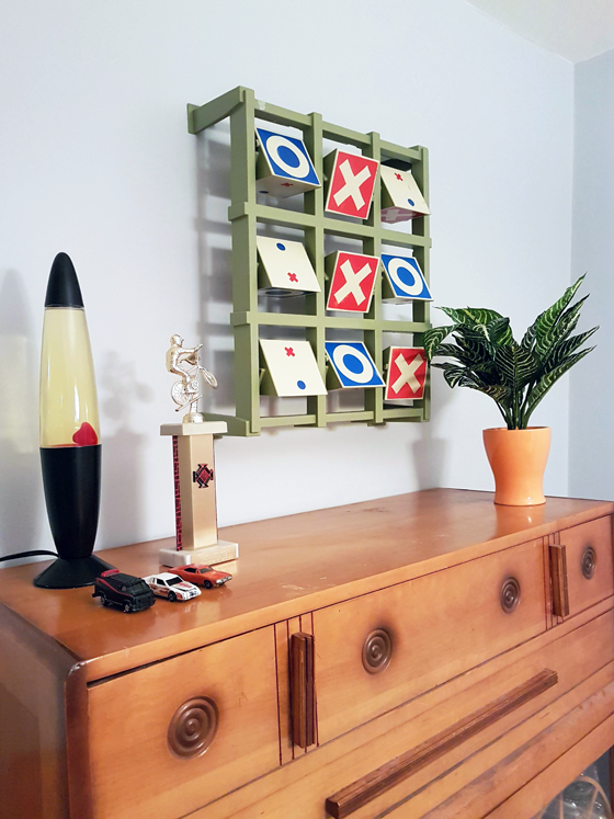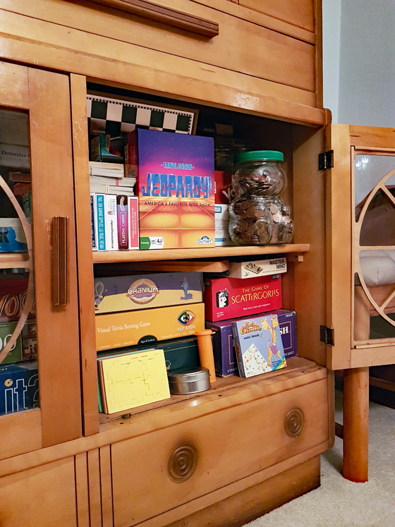 The upper one holds puzzles, colouring books and games for Ellie. Plus cards, flyers, coupons. It’s also our mail drop, wallet and phone charging station. The lower one holds sunglasses, sunscreen, bug spray, masks and some outdoor toys and tools. In the winter it stashes hats, mitts and scarves. Both dressers have empty drawers, so we have more than enough storage for now.