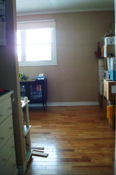 And here’s how the bumpout looks from outside the bathroom. It’s not obtrusive and gives us a nook perfectly sized for a storage cabinet just outside the laundry room.