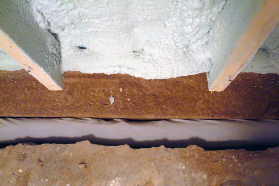 The crew then peeled back the carpet, scraped the sprayfoam insulation off the bottom of the wall going up about 16 inches, removed the bottom plate and cut about 16 inches off the studs.