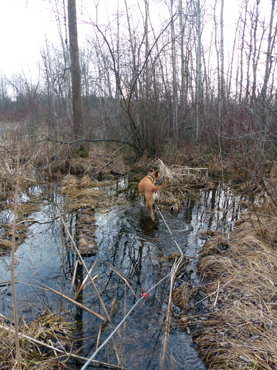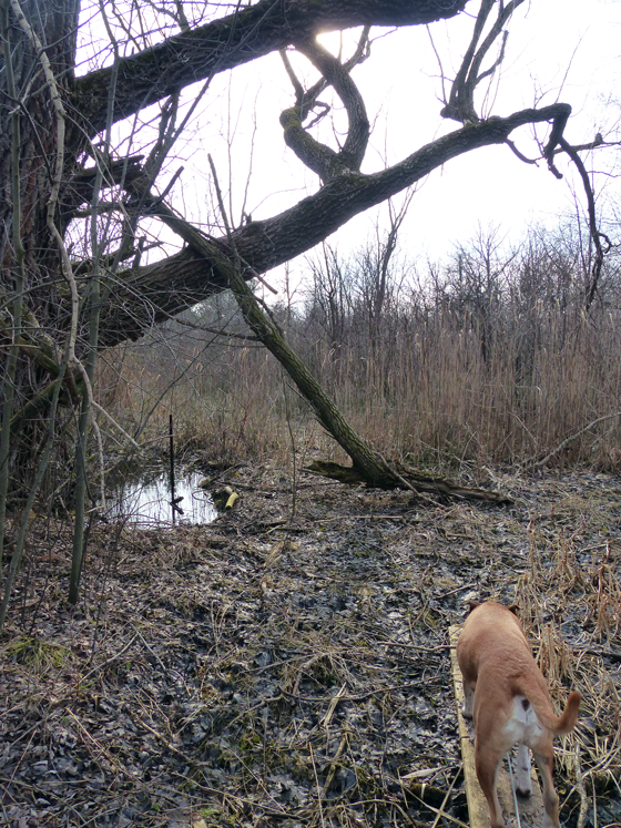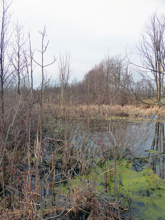 At the end of the trail, we reach the east boundary of our property. Looking to the north, somewhere on the other side of this marsh, is the other half of our trail network.
