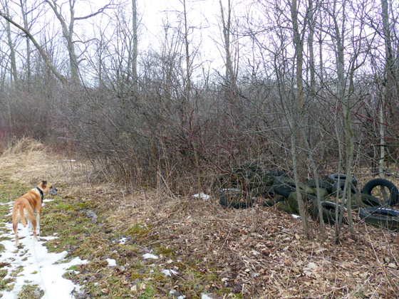At the edge of the back field are a couple of large piles of tires. Aren’t these ugly? I still think we could upgrade our catwalks using these as “piers” and laying skids across them to make a boardwalk.