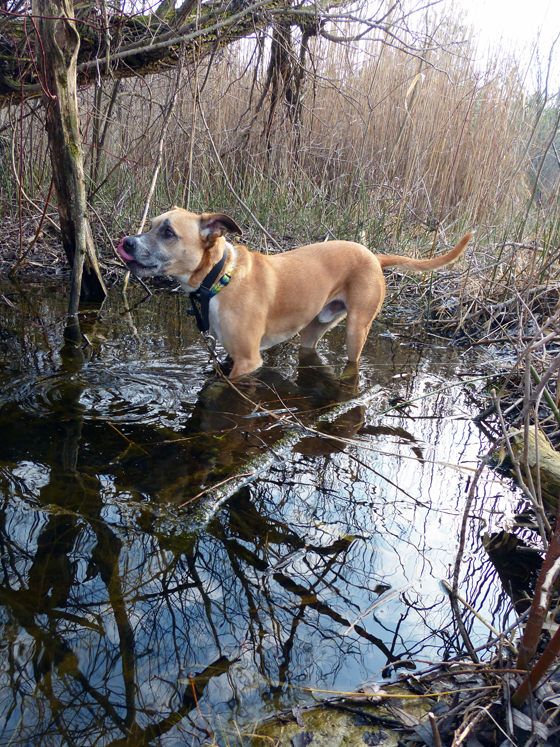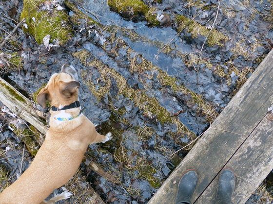 The trails are wet though. Matt and his Dad had laid a catwalk through the first marshy section, but it floated away a little while ago. We can sneak around on the right edge of the trail, but, of course, a tree has fallen to block the way. It’s a choice of hurdle or limbo and don’t fall in the water.