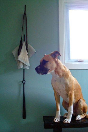 I reused the two sets of hooks from the old mudroom, installing the wire one in the cupboard and removing the three wrought iron hooks from their backing board and hanging them vertically to handle leashes, the towel we use to wipe Baxter’s feet before he comes in the house and our ever-so-handy shoe horn.