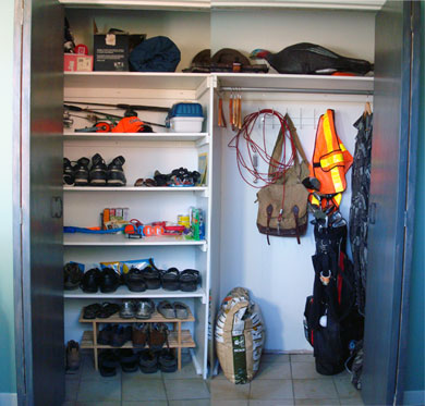 Along with addressing form, I also had to address function, which mostly meant the closet. I decided to split the closet in half, allocating one part for hanging some of our outdoor gear and storing taller items and at the other end adding floor to ceiling shelves for everything from shoes to cat treats to dog toys to work gloves to sport equipment.