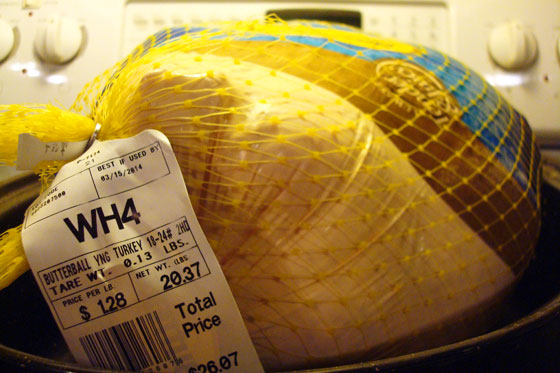Of course, the decor is only one small part of a successful dinner party. The most important part–the food!–was a hit as well. While I was running around in the freshly fallen snow, gathering tree boughs and searching for similarly-sized pine cones, Matt took charge of our 20 pound turkey.